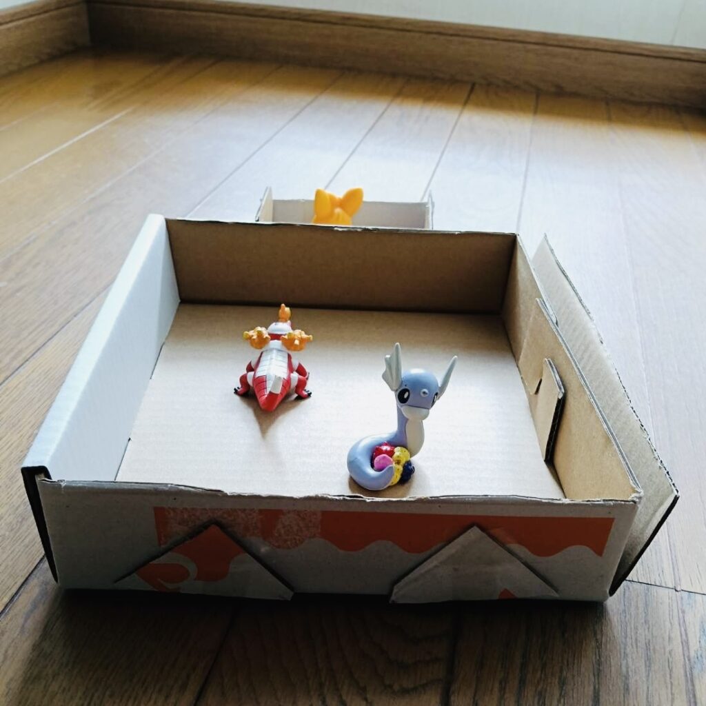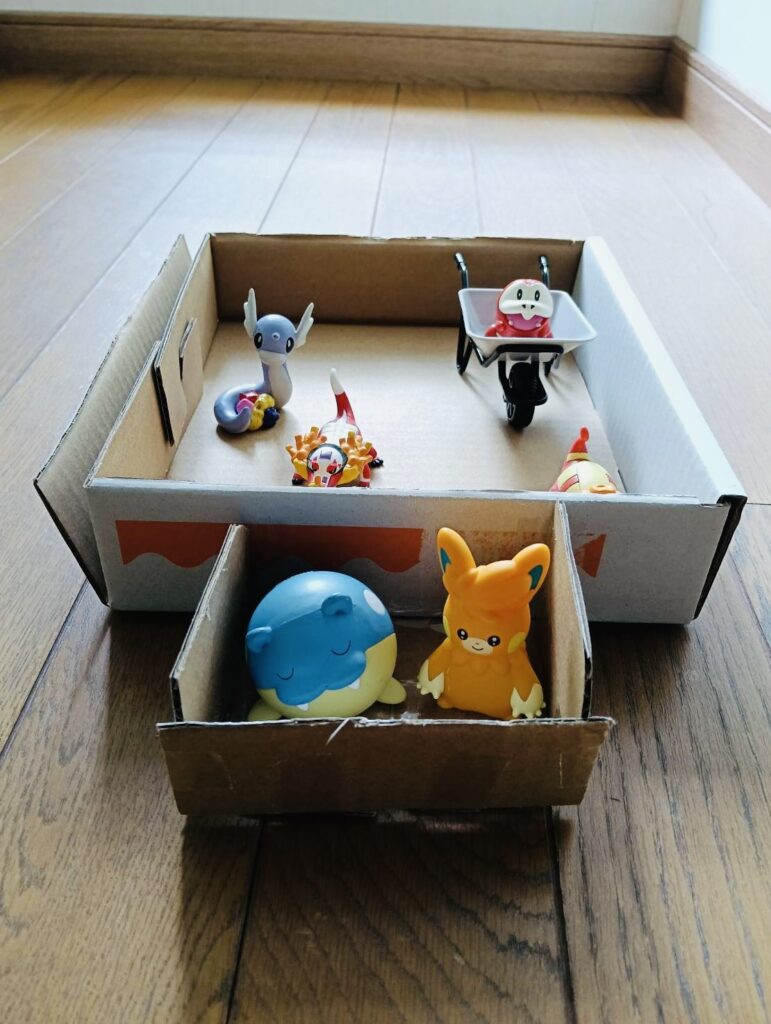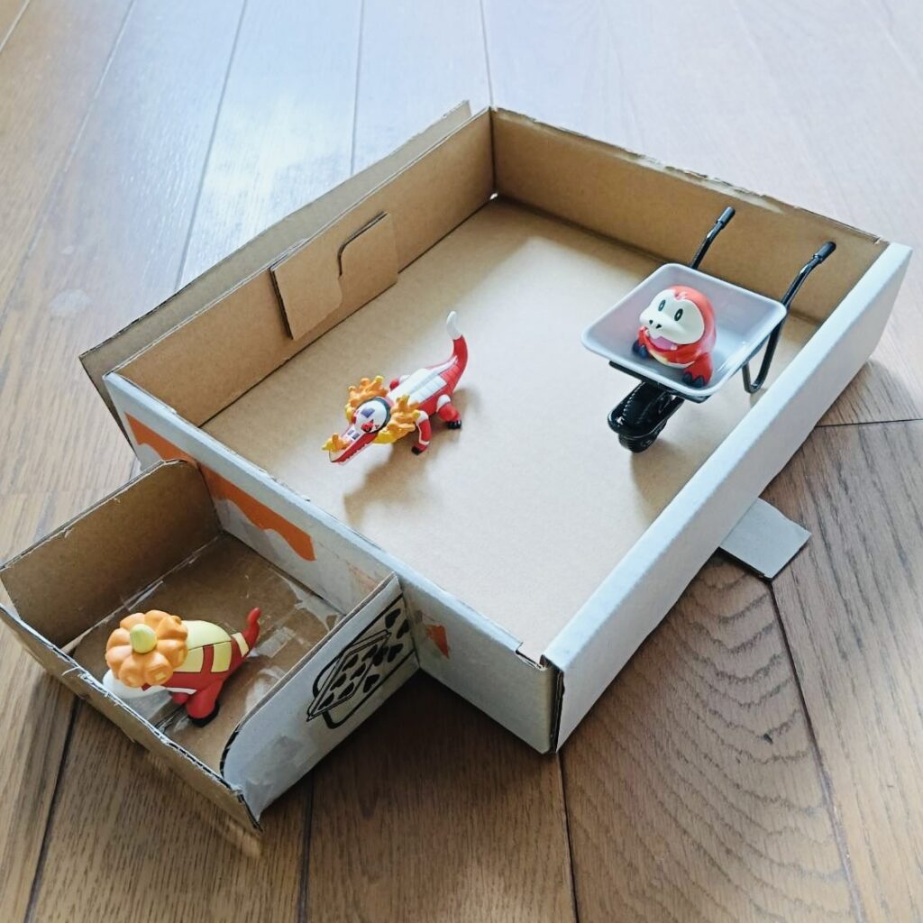 じゅんくんは、お家にあった段ボールを使って、ポケモンの仲間たちが入る乗り物を作ってくれました!この乗り物にポケモンたちの荷物も入れることができるとのこと。