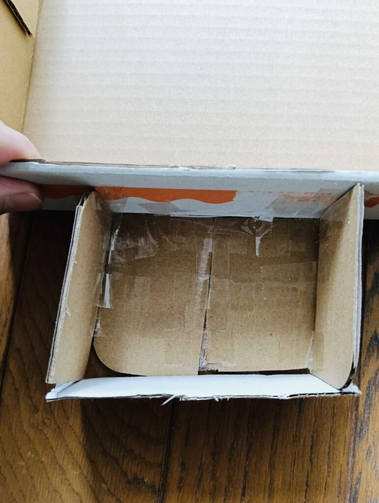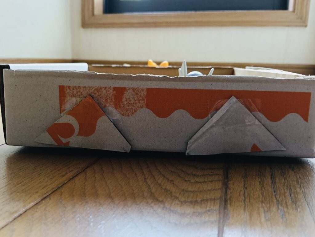 大きな四角は段ボールの箱の大きさを活用して作ったもの。小さな四角はこの段ボールのふたを切ってセロテープで貼って運転席を作ったとのこと。側面には、三角の形をしたものが見えます。