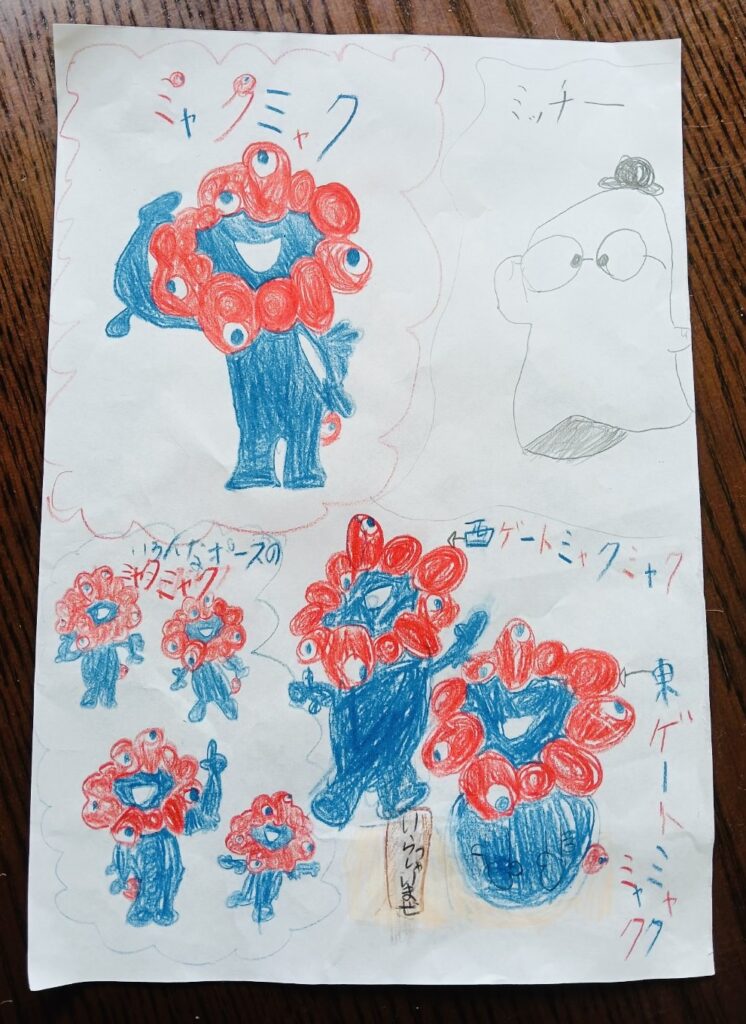 ののちゃんは、関西万博のキャラクターであるミャクミャクと会場内にあるガスパビリオンのキャラクター・ミッチーを色鉛筆で描いてくれました✨