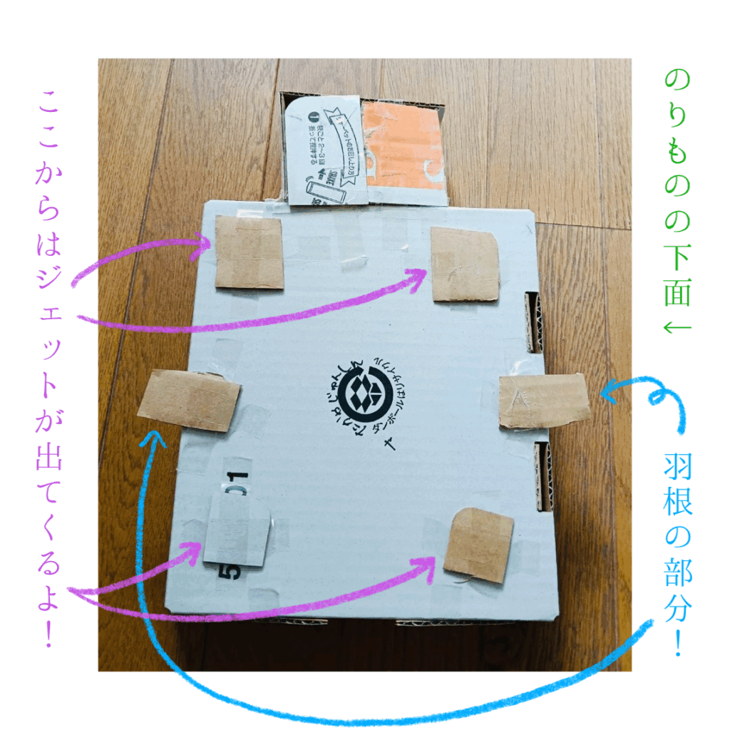 こちらは、4つのジェットから火が出ているのを表現したとのこと。両横には飛行機のような羽根がついています。この乗り物、飛ぶ前に「シューッ」というのが出てくるよ!と、嬉しそうにじゅんくんが話してくれました。