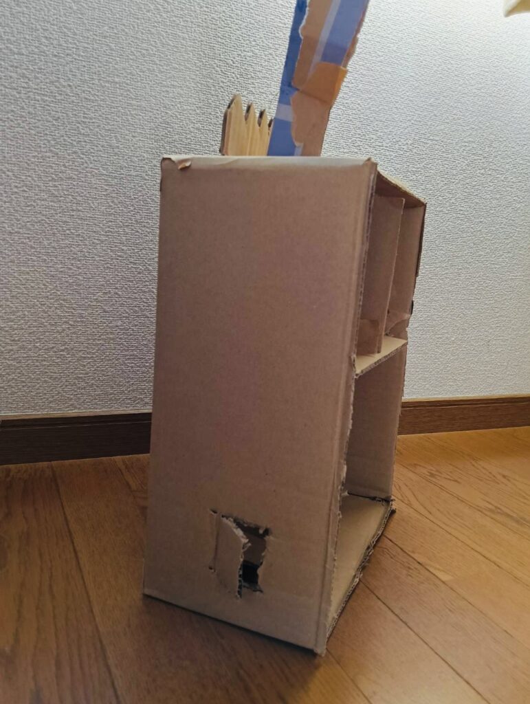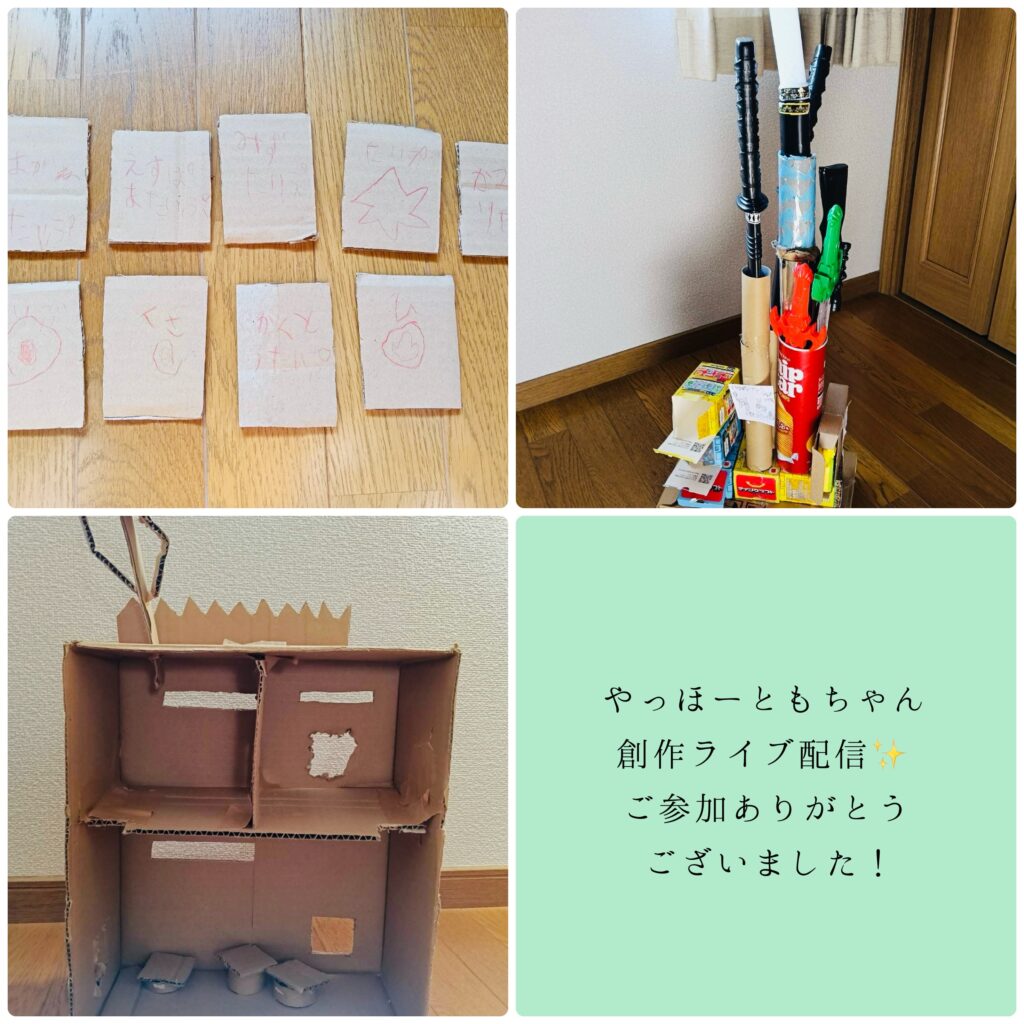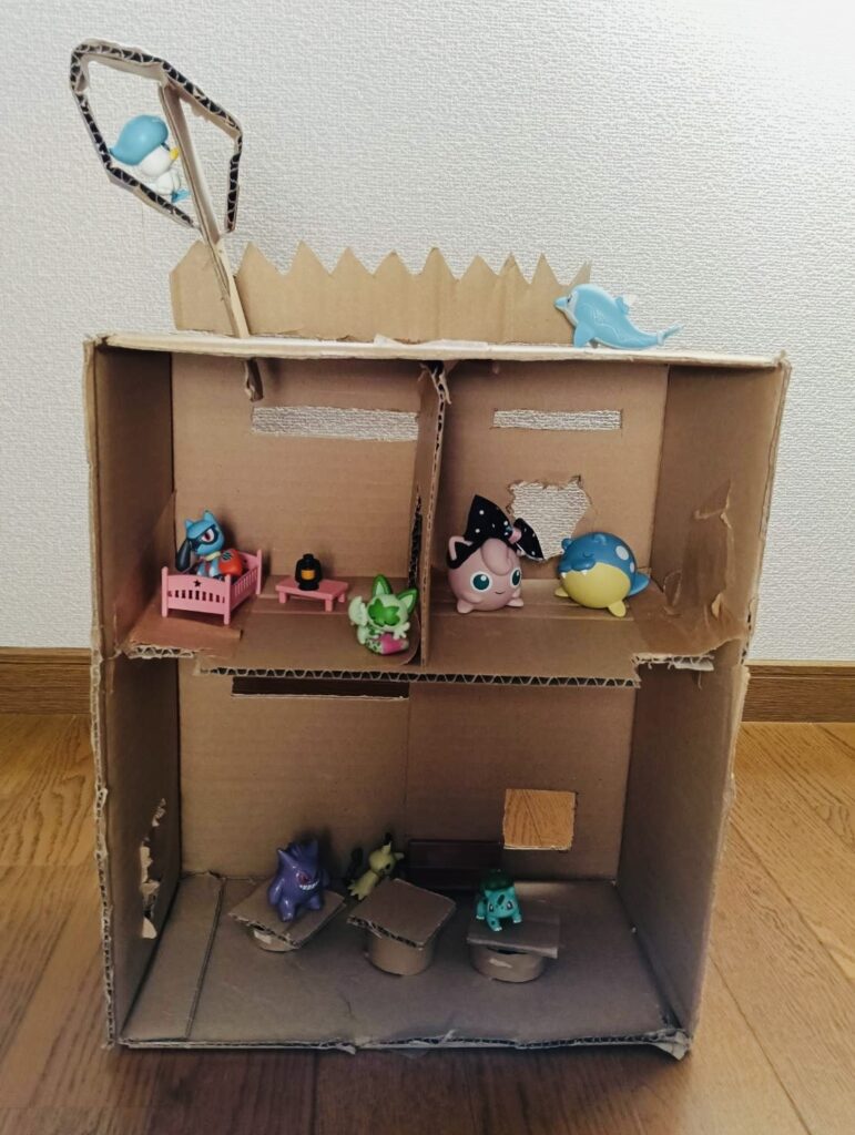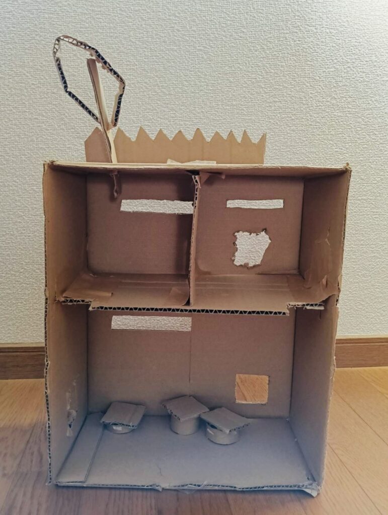 チップスターの箱や、トイレットペーパーの芯、それからマインクラフトの箱が増えて、ダンボールが土台になっています。
