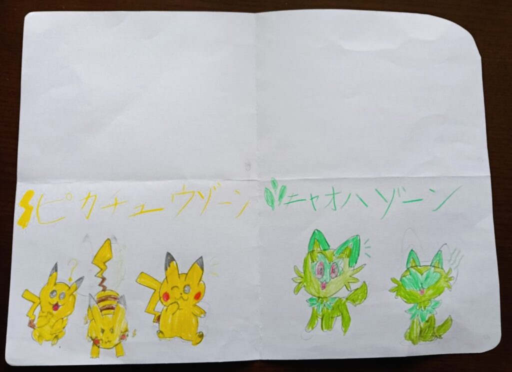 ののちゃんは、画用紙にポケモンのキャラクターであるピカチュウとニャオハを色鉛筆で描いてくれました^^