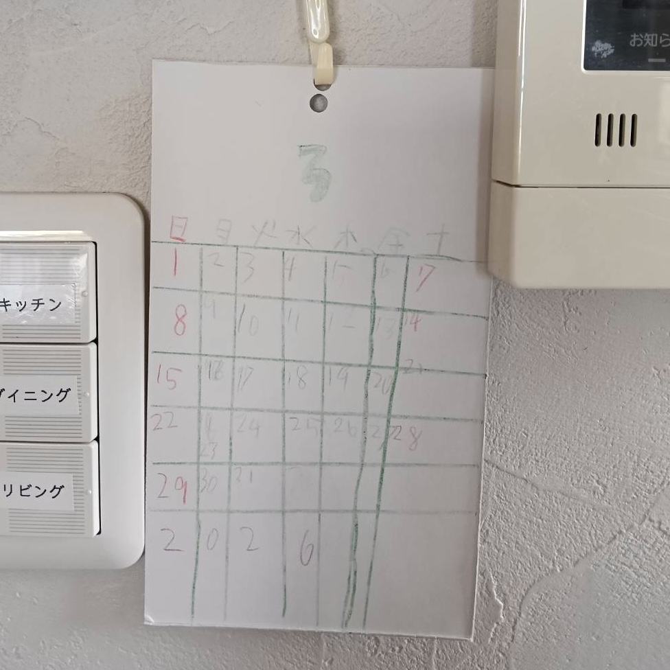写真をご覧いただくとわかりますが、電話があるところに飾るつもりで作ってくれたとのこと。去年この場所にかかっていたカレンダーと同じくらいのサイズで作ろうとじゅんくんが取り組んでくれたのでした!