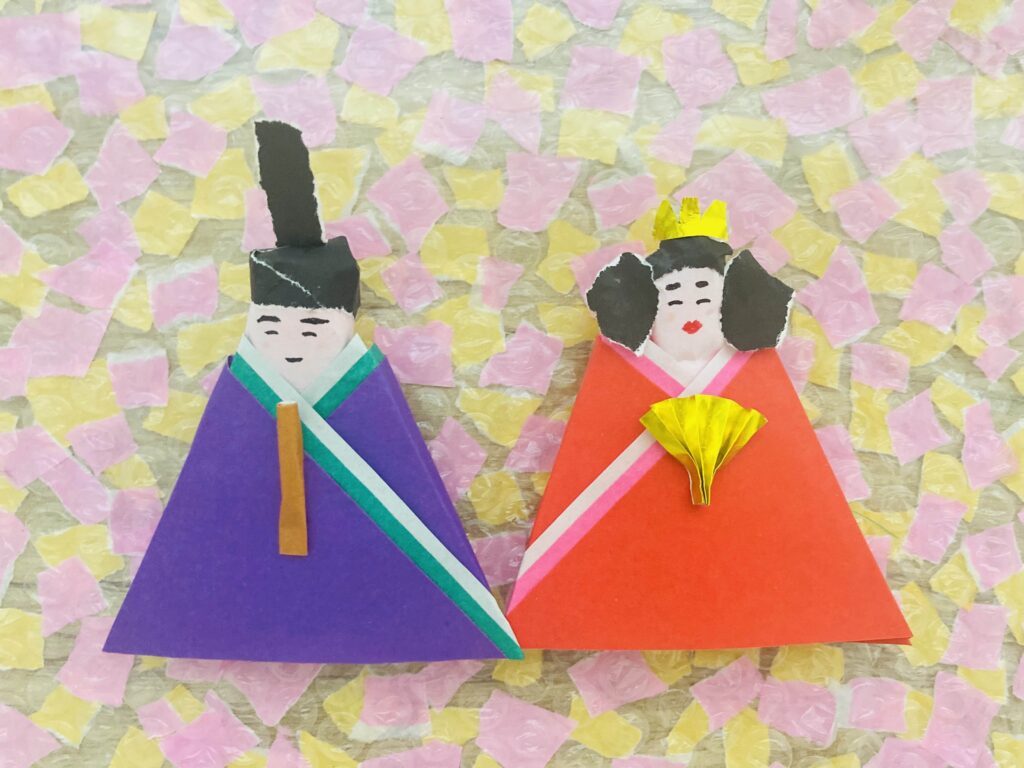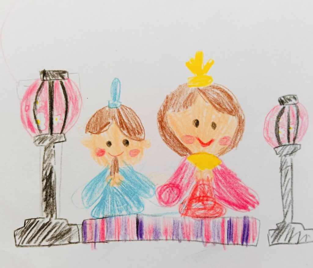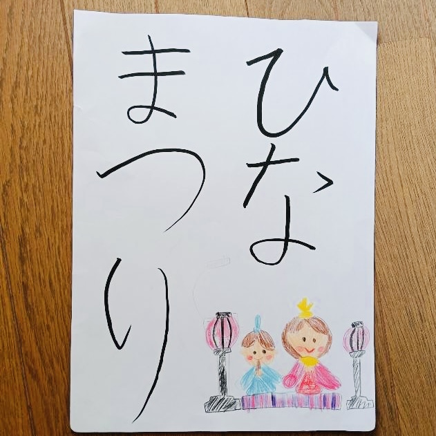 文字を書いたあとは、おだいりさまとおひなさまを描いてくれました。二人の表情がとってもにこやかでかわいらしいですね。ののちゃん曰く、おひなさまの胴体を描くのが難しかったとのこと。それから、「ひなまつり」の文字の大きさがバラバラになっちゃったのでほんとうは同じくらいの大きさにしたかったと聞かせてくれました。