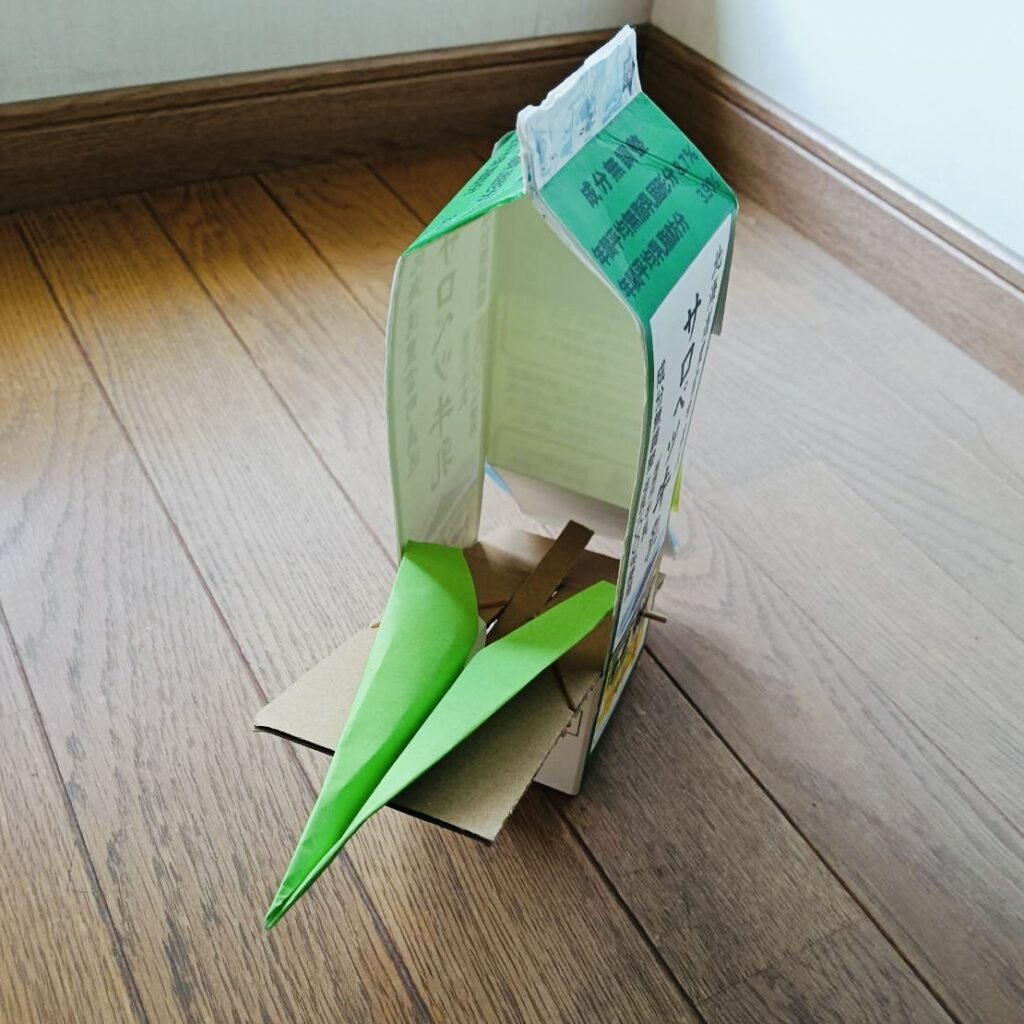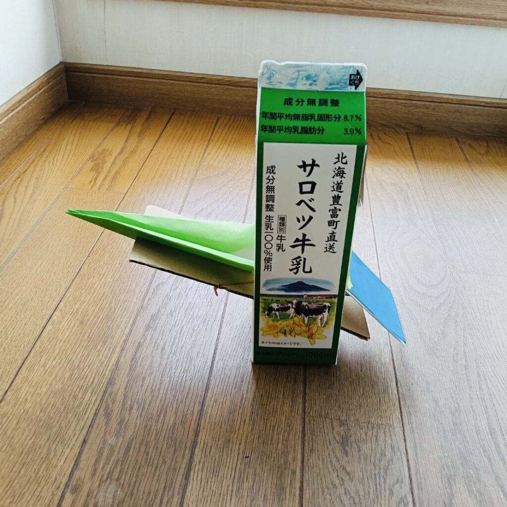 まず、一つ目の『かみひこうきとばし』は、開始の時点からすでに作るものは決まっているとのことで、牛乳パックや段ボールなどの材料を見せてくれたじゅんくん。