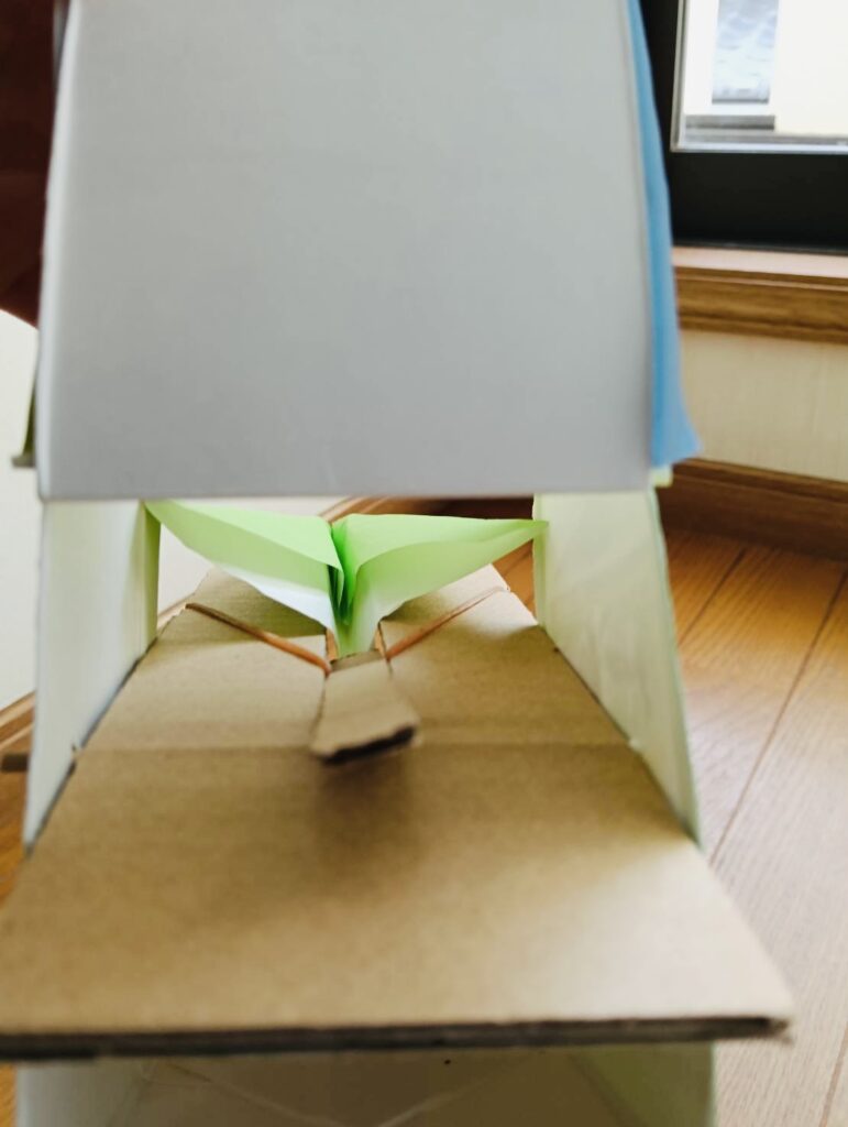 輪ゴムや紙ひこうきを使って、なんと! 紙ひこうきの発射台を作ってくれました。完成してから、紙ひこうきを実際に飛ばして見せてくれましたが、輪ゴムを使って、ぴよーんと、ほんとうに発射台から斜め上方向に飛んでいきました☺️